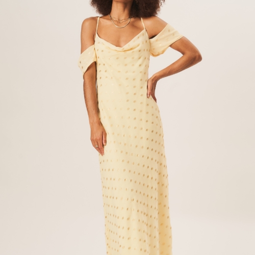 Upgrade your fashion game with our Yellow Cowl Neck Drop Sleeves Foil Maxi Dress. The elegant cowl neck and drop sleeves provide a modern twist, while the yellow color and foil detailing add a touch of glamour. Perfect for making a statement at any event.