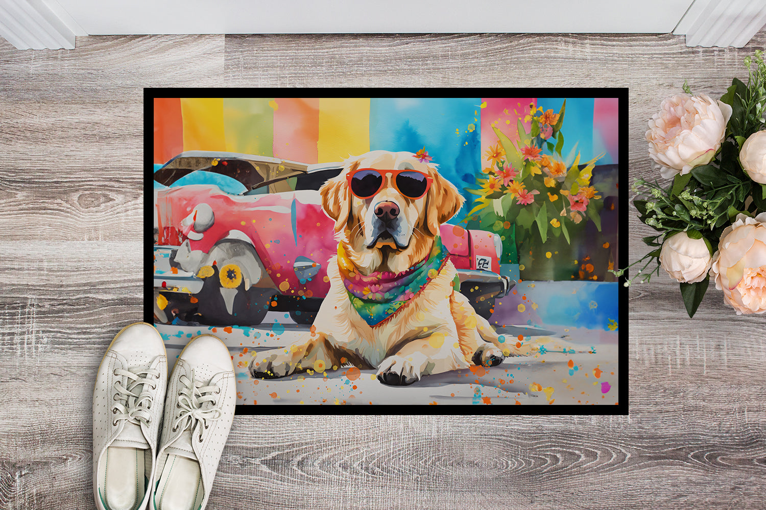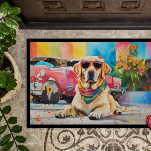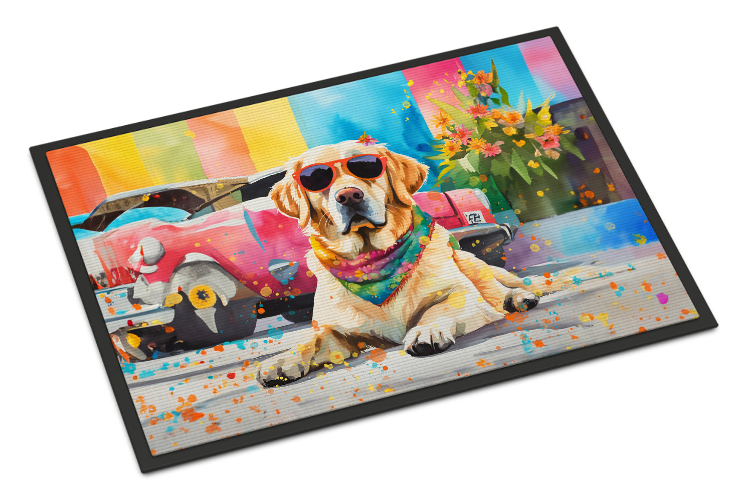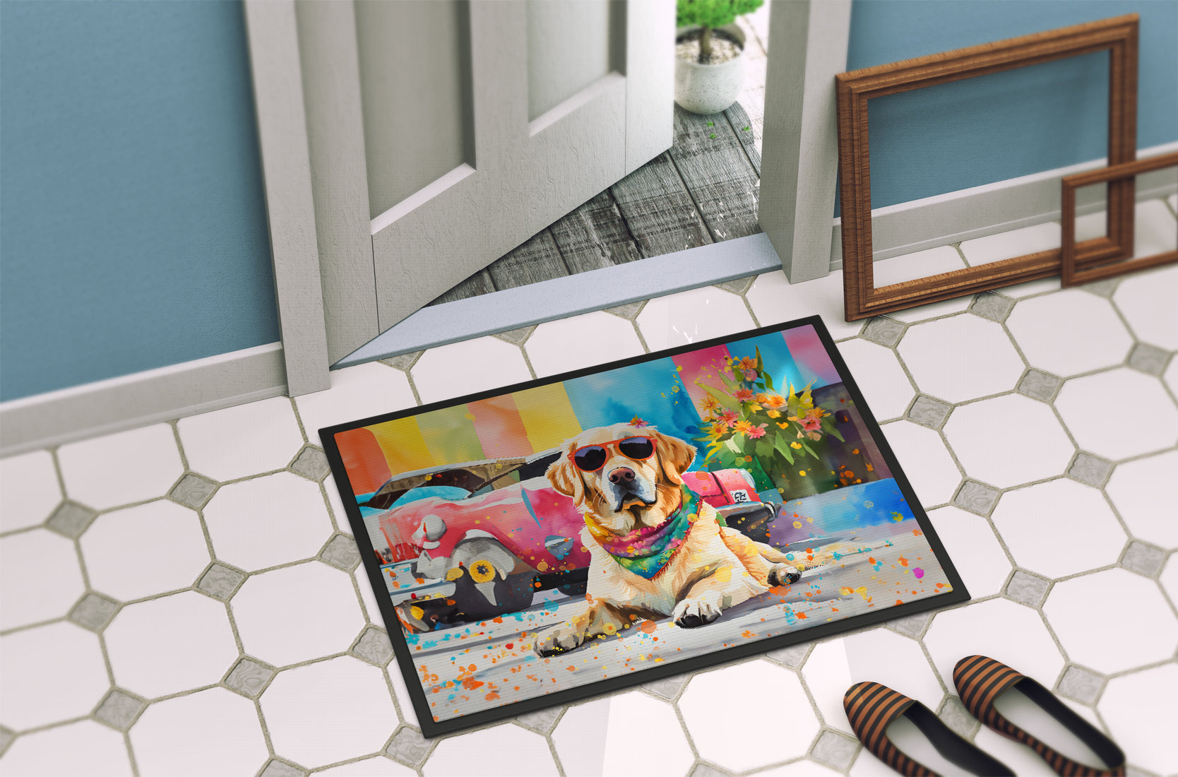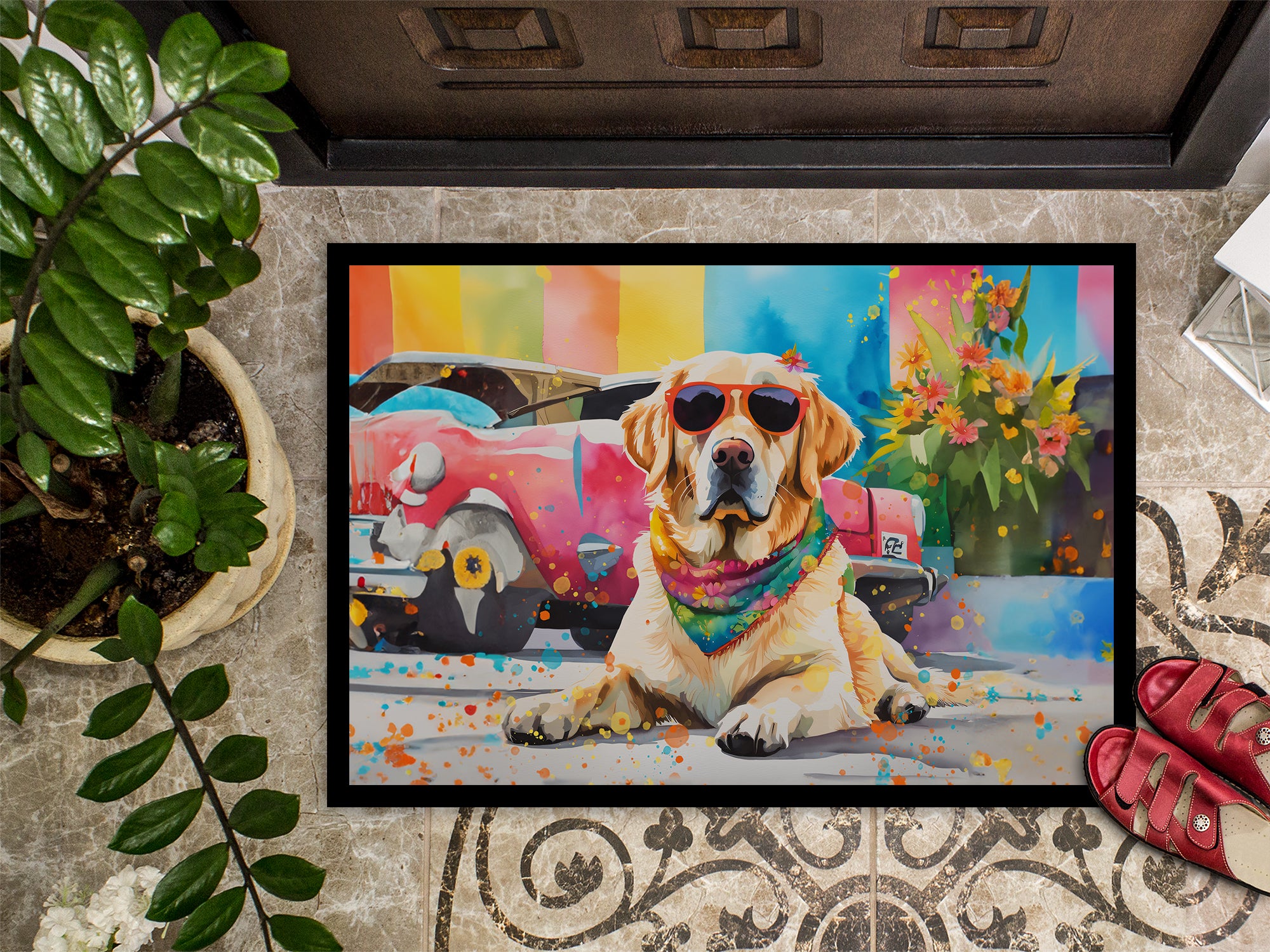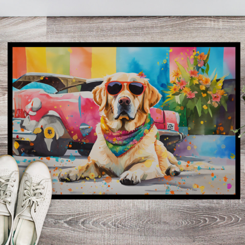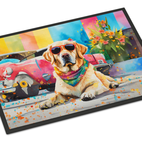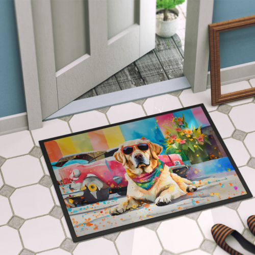 Doormat featuring breed specific Yellow Labrador artwork. Welcome your guests in style with our Artwork Door Mat, designed to withstand almost any weather condition. This mat, measuring approximately 18 by 27 inches, is held together by durable black binding tape. Its top layer, composed of polyester felt, is dyed with the eye-catching image you see on the mat. A few layers below provide the mat with stability, while its rubber bottom is stamped to help prevent slipping and ensures safety. Our mat works wonderfully as both an indoor or outdoor door mat. For cleaning, simply hose it off with water or use a power washer – no need for any cleaner that produces suds. Avoid scrubbing with a brush, instead, opt for the vacuum on floor setting. Designed manufactured and printed in the USA, this mat is a perfect addition to your porch, outdoor kitchen, entryway, or any indoor space. Its unique design makes it a charming decorative rug that greets your guests and adds a stylish touch to your home decor.