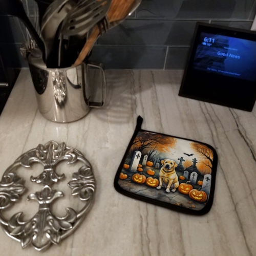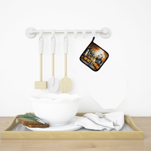 Pair of Pot Holders featuring breed specific Labrador Retriever artwork. Celebrate Halloween with this Halloween Pair of Pot Holders. A Pair of Pot Holders to match your kitchen decor. Made in the USA these are thick and functional. Full color artwork decorates the front polyester fabric of the hot pad and accented by a black trim. Use these at as a trivet for your Thanksgiving or Christmas tablescape. Filled with insulated fabric and quilted for durability. These colorful pot holders will make a great gift for your favorite home cook or executive chef. Each pot holder measures approximately 7 1/2 inches by 7 1/2 inches. A hanging tab is included.