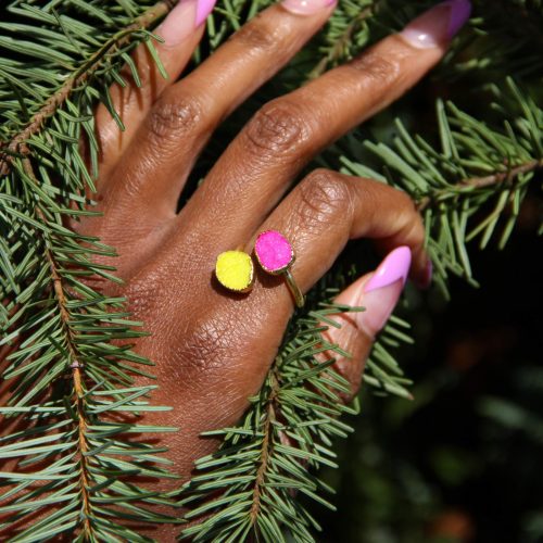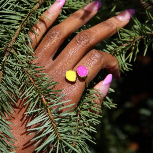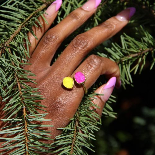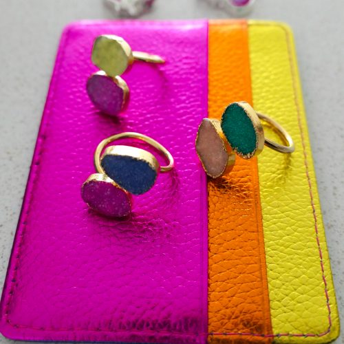 Colourful druzy stone gold adjustable rings set in gold-plated metal.  The colour intensities and shapes vary from ring to ring making each item unique!  A beautifully created ring at an affordable price bang on trend with this season’s colour craze.