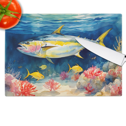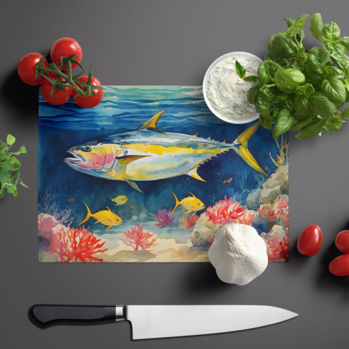 Glass Cutting Board featuring breed specific Yellowfin Tuna artwork. Introduce your kitchen to the vibrant, large Decorative Glass Cutting Board from Caroline’s Treasures. Crafted from resilient tempered glass, this board is not only a utilitarian necessity but also a colorful art piece. With its generous dimensions of 15 inches in height and 12 inches in length, it offers ample space for all your cutting needs. Every piece showcases captivating artwork from distinguished artists, bringing an aesthetic edge to your kitchen. Beyond its attractive design, this cutting board ensures your countertop stays pristine and unscathed, owing to its heat-resistant properties. Engineered with user convenience in mind, it features non-skid feet for stability, and rounded corners for additional safety. Its robust construction renders it virtually unbreakable, guaranteeing longevity. The board comes with protective feet bumpers, maintaining its position during use. This product is recommended to be hand washed only. Proudly printed and assembled in the United States, this cutting board exemplifies superior craftsmanship. With Caroline’s Treasures’ Decorative Glass Cutting Board, you’re investing in a blend of functionality and artistic flair.