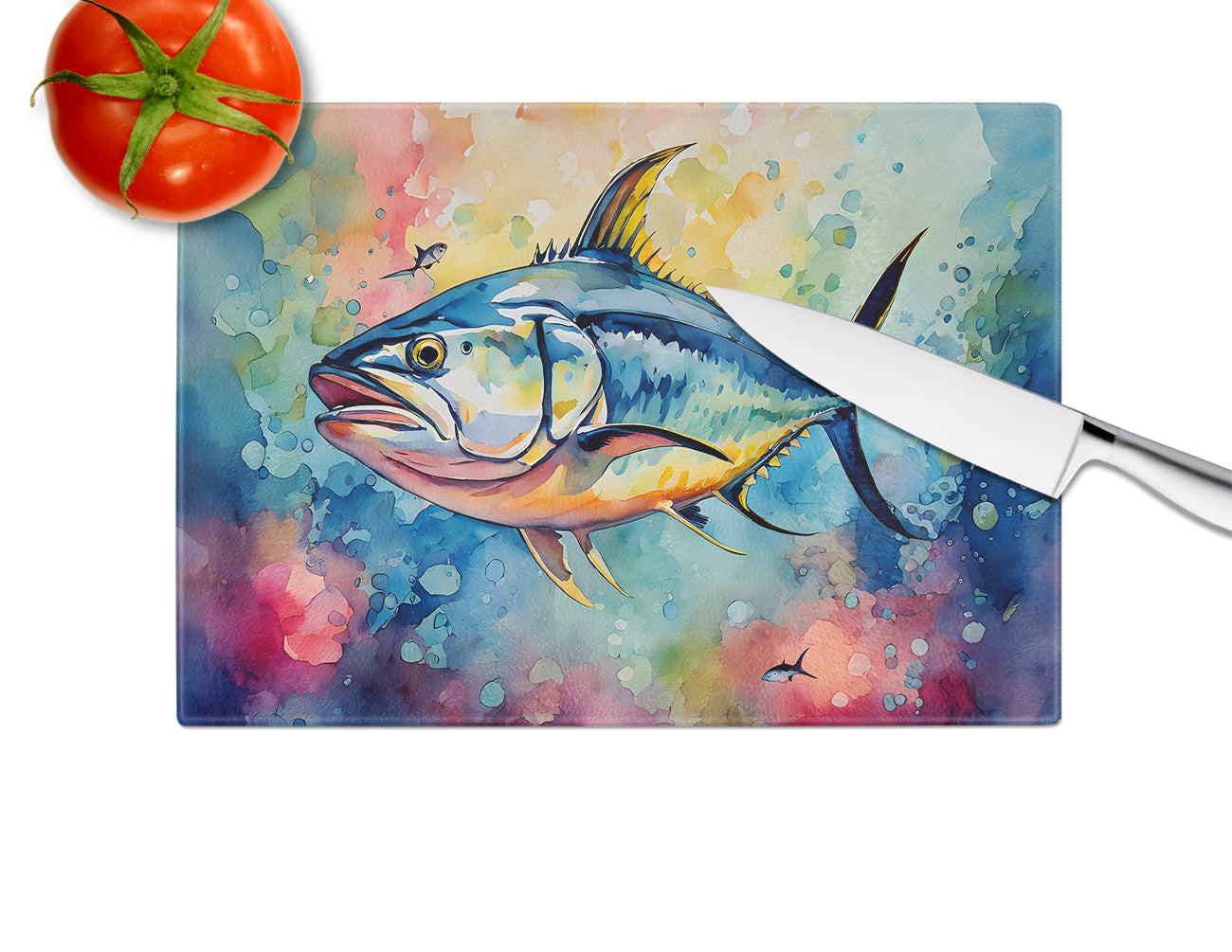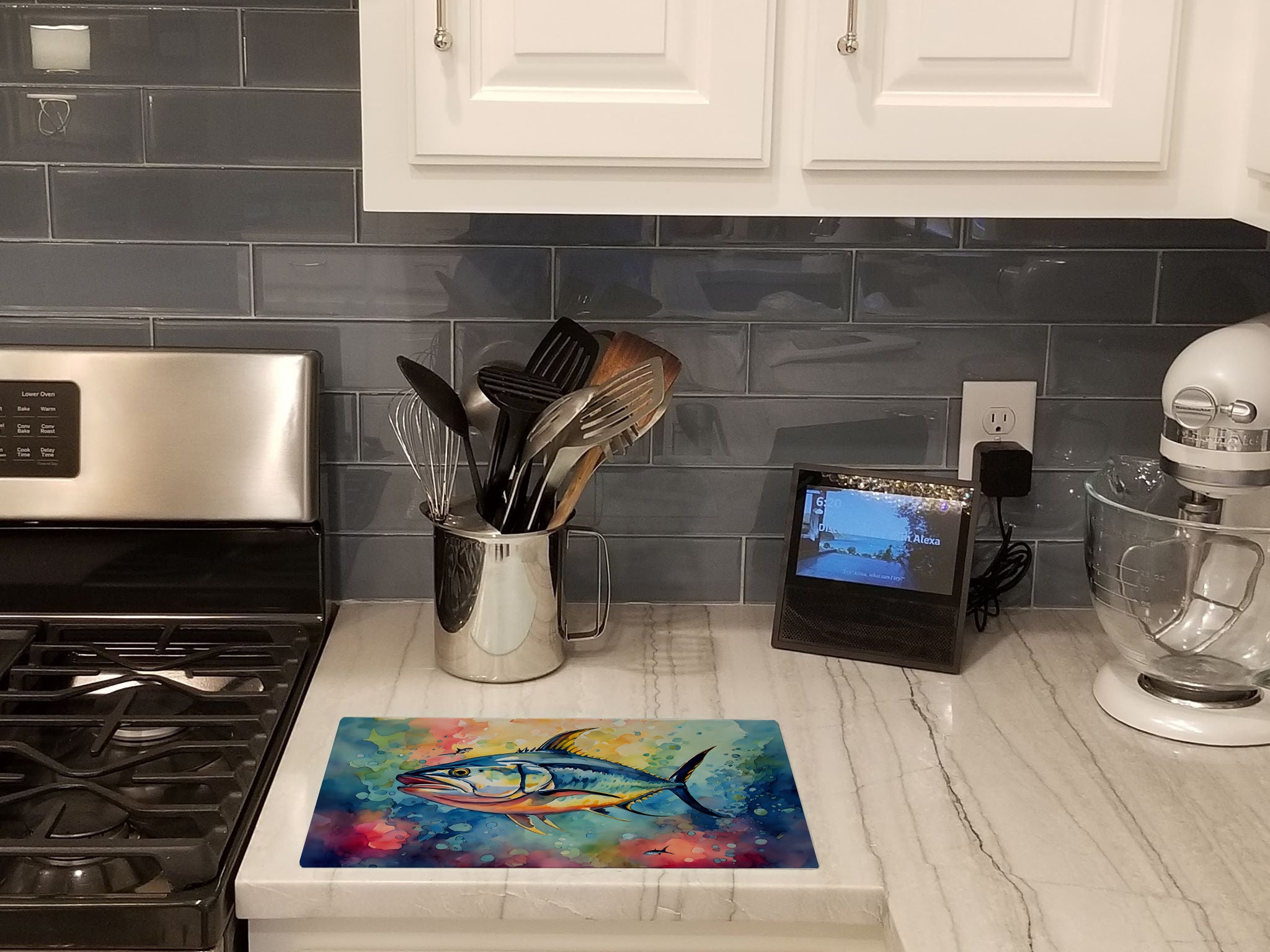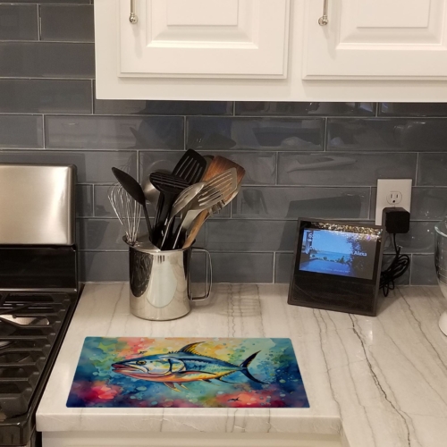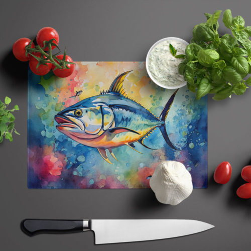 Glass Cutting Board featuring breed specific Yellowfin Tuna artwork. Introduce your kitchen to the vibrant, large Decorative Glass Cutting Board from Caroline’s Treasures. Crafted from resilient tempered glass, this board is not only a utilitarian necessity but also a colorful art piece. With its generous dimensions of 15 inches in height and 12 inches in length, it offers ample space for all your cutting needs. Every piece showcases captivating artwork from distinguished artists, bringing an aesthetic edge to your kitchen. Beyond its attractive design, this cutting board ensures your countertop stays pristine and unscathed, owing to its heat-resistant properties. Engineered with user convenience in mind, it features non-skid feet for stability, and rounded corners for additional safety. Its robust construction renders it virtually unbreakable, guaranteeing longevity. The board comes with protective feet bumpers, maintaining its position during use. This product is recommended to be hand washed only. Proudly printed and assembled in the United States, this cutting board exemplifies superior craftsmanship. With Caroline’s Treasures’ Decorative Glass Cutting Board, you’re investing in a blend of functionality and artistic flair.
