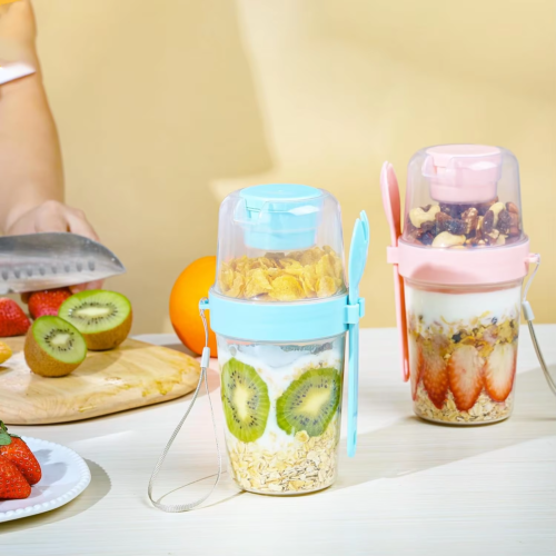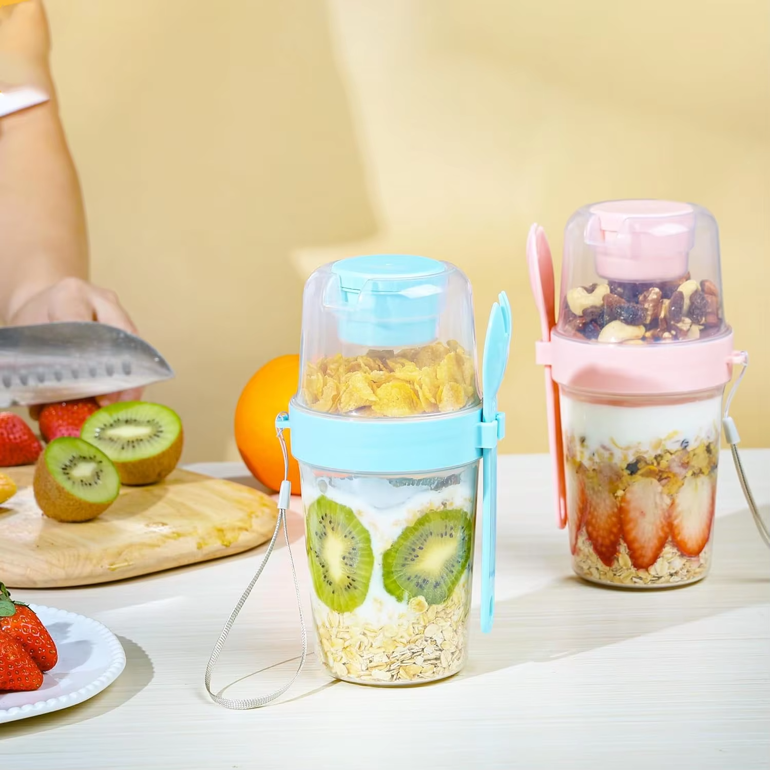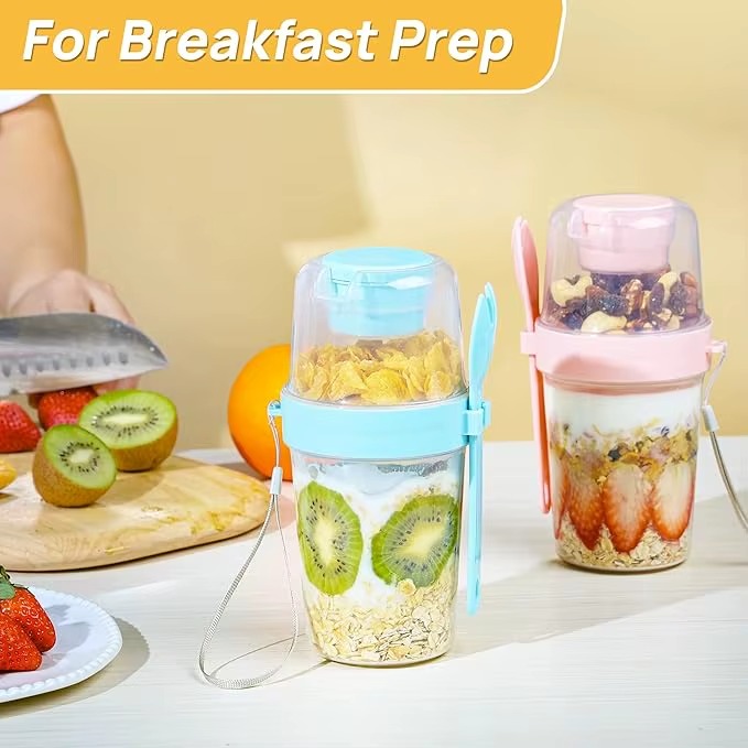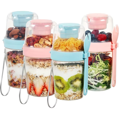 Layer Design: The yogurt parfait cup features two separate storage compartments, keeping wet and dry ingredients separate; enjoy your lunch or breakfast without worrying about soggy or mushy foodHigh Quality: Made from food-grade, BPA-free material, our snack container is dishwasher safe, offering durability and convenience for daily usePortable: The salad container cup set has folding handle upgraded design and comes with a sauce cup and a fork, fitting perfectly in most breakfast and lunch bags—ideal for enjoying salads, yogurt, or snacks, including crunch cup and cereal cup on-the-goSeal Desigh: Both the lid and dressing cup feature silicone seal rings, ensuring no spills even if the container is turned upside down, keeping your food secure and fresh for a long timeEasy to Fill and Clean: The wide-mouth design makes filling and retrieving food simple, while the smooth inner surface of the material ensures effortless cleaning after use