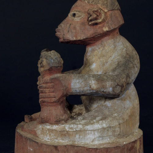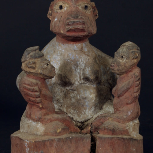This sculpture featuring a mother and her twin children was used in a family’s household shrine for the ritual purpose of promoting the health of her children and her family.8 x 11 3/4″ tall (20 x 30 cm)