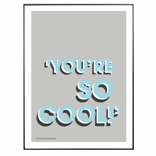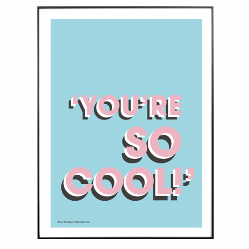 ‘YOU’RE SO COOL!’ you really are! Any True Romance lovers our there? This is one of our favourite films of all times and we used the True Romance – Hans Zimmer tune for our wedding entrance to our ceremony, it is such a beautiful song. I really love the end scene of the film where Alabama says “you’re so cool, you’re so cool, you’re so cool” and it is what inspired our typographic print/poster and why we’ve used the letters three times. Create the perfect True romance setting with this fun print in any room in the home. Perfect for father’s day present too.