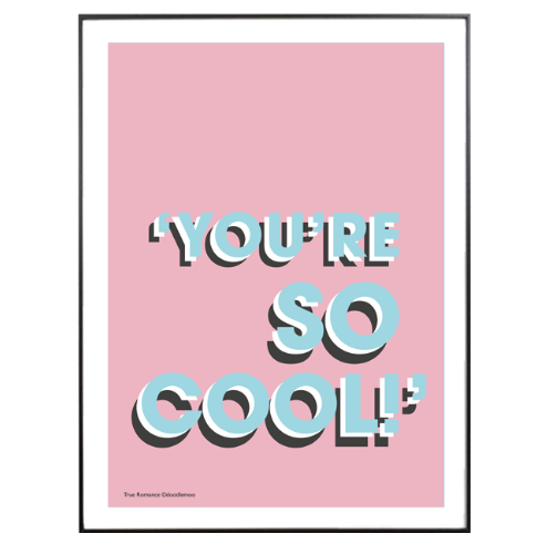 ‘YOU’RE SO COOL!’ you really are! Any True Romance lovers our there? This is one of our favourite films of all times and we used the True Romance – Hans Zimmer tune for our wedding entrance to our ceremony, it is such a beautiful song. I really love the end scene of the film where Alabama says “you’re so cool, you’re so cool, you’re so cool” and it is what inspired our typographic print/poster and why we’ve used the letters three times. Create the perfect True romance setting with this fun print in any room in the home. Perfect for father’s day present too.