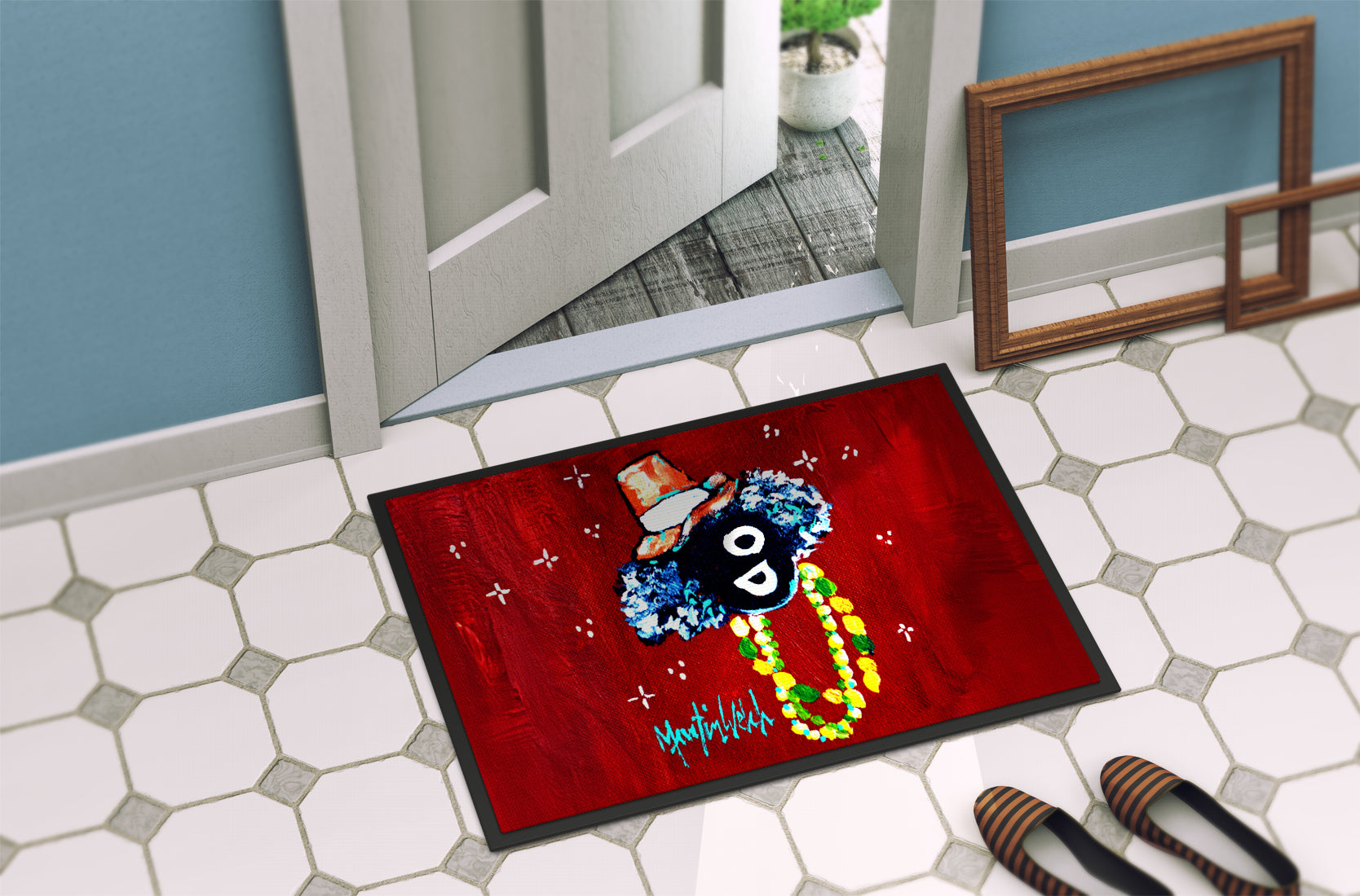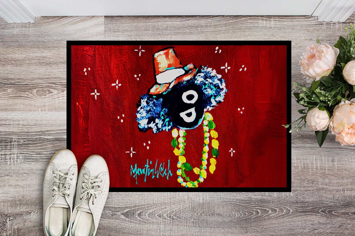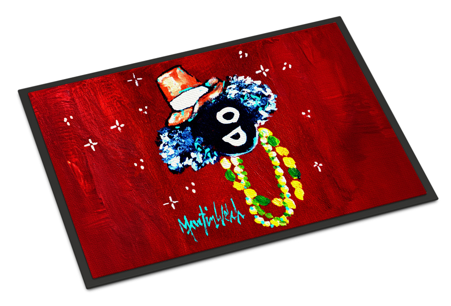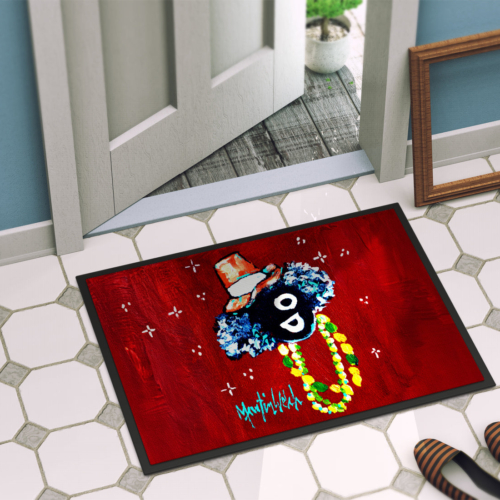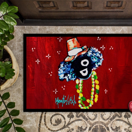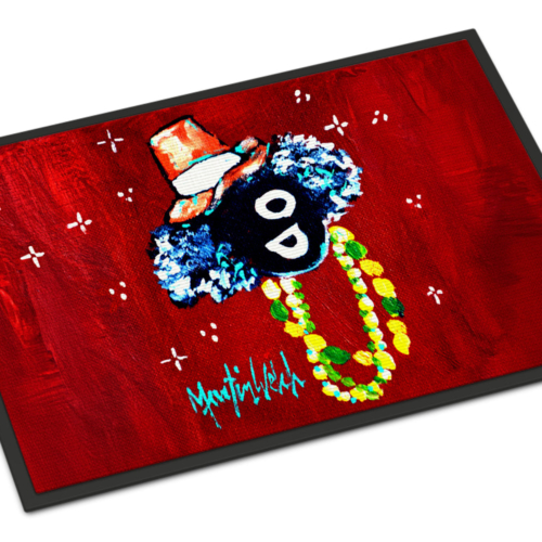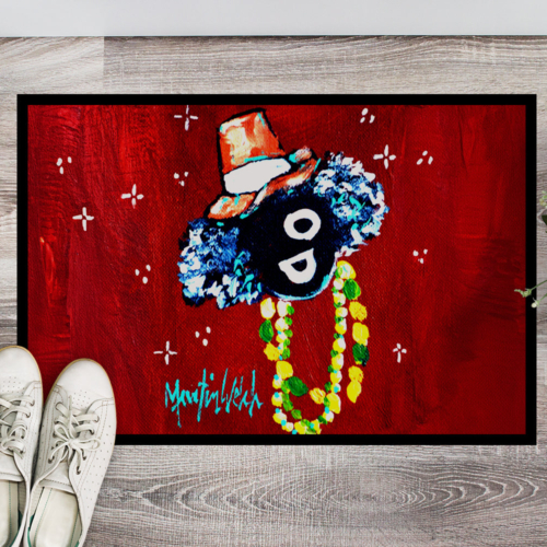 Celebrate Mardi Gras with this Mardi Gras Doormat. Welcome your guests in style with our Artwork Door Mat, designed to withstand almost any weather condition. This mat, measuring approximately 24 by 36 inches, is held together by durable black binding tape. Its top layer, composed of polyester felt, is dyed with the eye-catching image you see on the mat. A few layers below provide the mat with stability, while its rubber bottom is stamped to help prevent slipping and ensures safety. Our mat works wonderfully as both an indoor or outdoor door mat. For cleaning, simply hose it off with water or use a power washer – no need for any cleaner that produces suds. Avoid scrubbing with a brush, instead, opt for the vacuum on floor setting. Designed manufactured and printed in the USA, this mat is a perfect addition to your porch, outdoor kitchen, entryway, or any indoor space. Its unique design makes it a charming decorative rug that greets your guests and adds a stylish touch to your home decor.