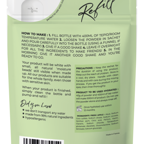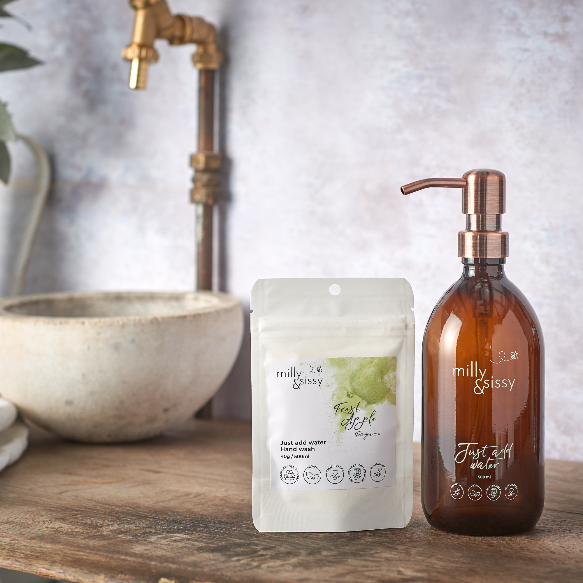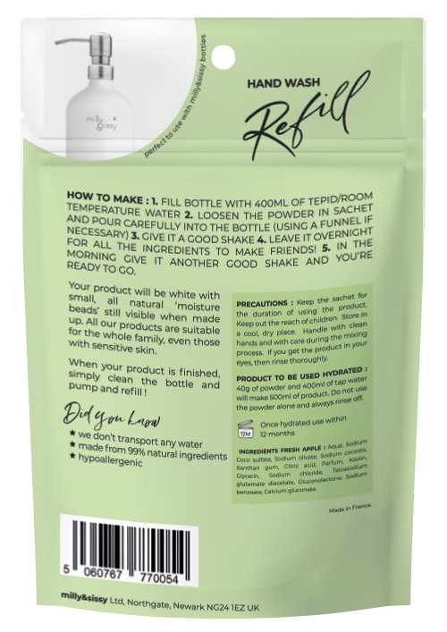 Our delicately fragranced Fresh Apple is made from 99% natural ingredients and once water is added, will make 500ml. This low lather hand wash will leave your hands feeling smooth, moisturized and clean and leave your conscience clear knowing you’ve made a good choice for the planet.