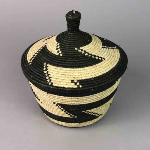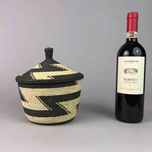 These Batwa baskets stand out among African baskets due to their exceptionally tightly woven, small coils as well as their contemporary designs. The Batwa – the Twa people, a “pygmy” people – live in the border area of southwestern Uganda, northwestern Rwanda and eastern Congo, in the area of the Ruwenzori Mountains, in the Bwindi Impenetrable Forest. They live among a native gorilla population just like we live among whitetail deer. 8” tall x 7 1/2” top diameter.