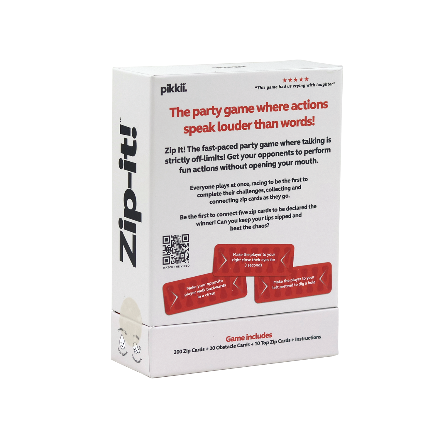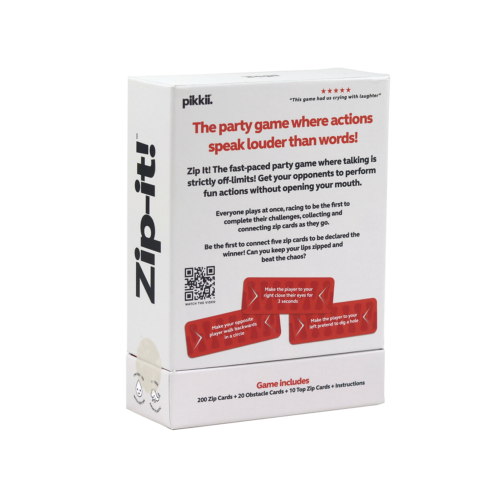 The party game where actions speak louder than words! The fast-paced party game where talking is strictly off limits. Get your opponents to perform fun actions without opening your mouth. Everyone plays at once, racing to be the first to complete their challenges, collecting and connecting zip cards as they go. Be the first to connect 5 zip cards to be declared the winner. Can you keep your lips zipped and beat the chaos?