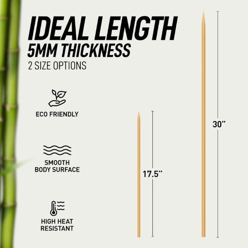 Each set contains 40 bamboo skewers. Each marshmallow roaster is 17.5-inches in length with a 5mm diameter for best durability and safety. Bamboo does not get heated so they are safer compared to other skewers, especially if you are looking for something for young kids. They also come with blunted tips and have the perfect length to keep your hands away from the heat.