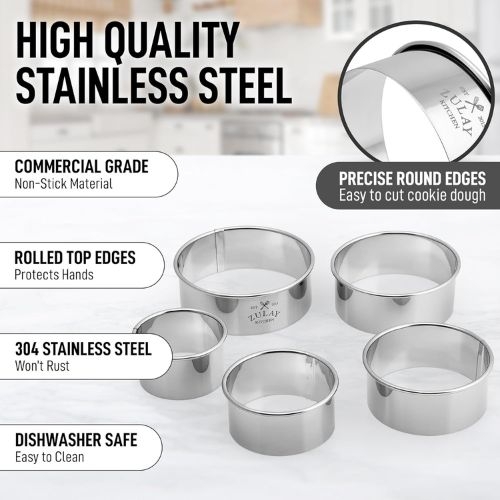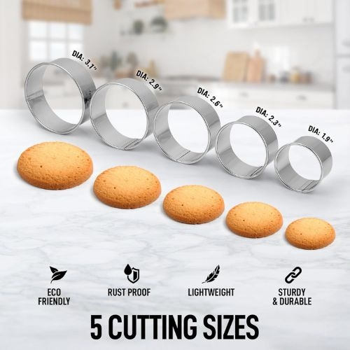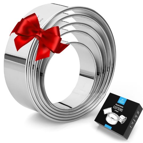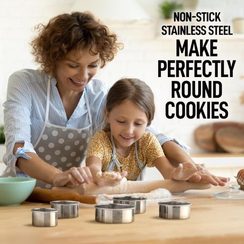 Get that perfect cookie shape with the Zulay Kitchen Round Cookie Cutters. Made with premium quality stainless steel with a classic polish finish that is suitable to use for all-year-round. Perfect for making home-made, professional baked goods including cookies, ravioli, and more. Thanks to their heat-resistant stainless steel construction, they can also be used to cook perfectly shaped eggs and pancakes for breakfast.
